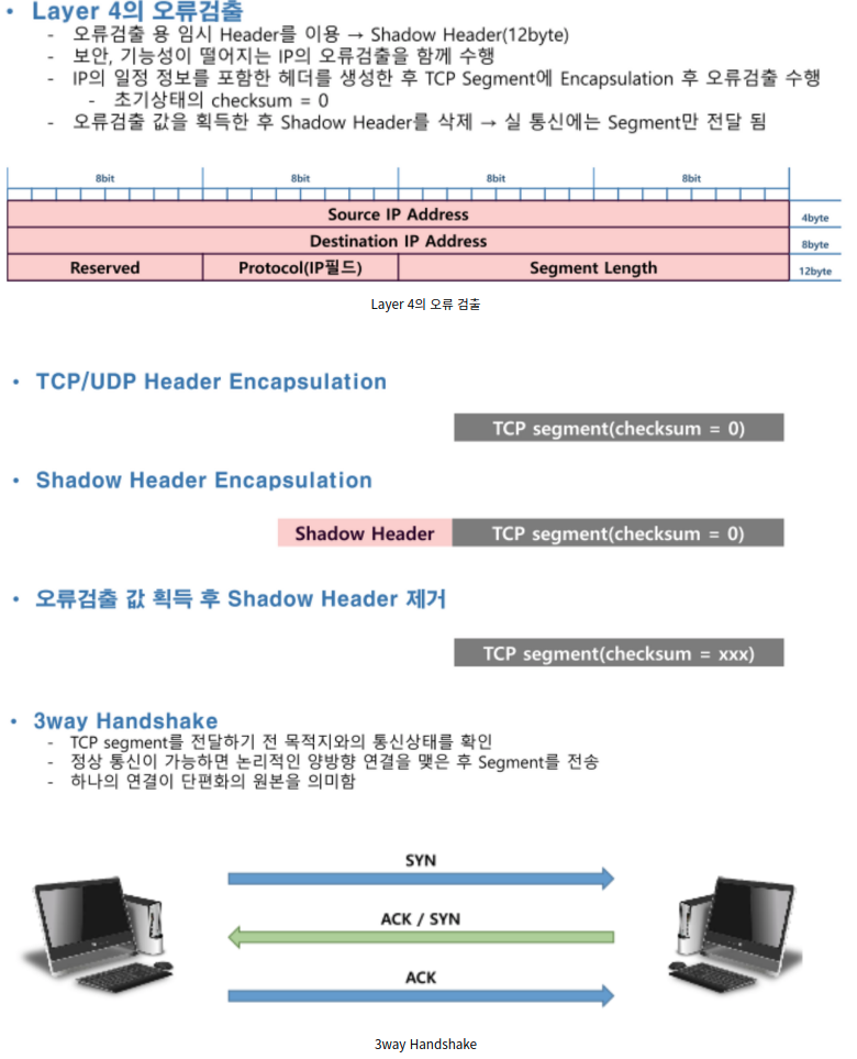 - Datagram 전체와 3계층 정보 중 일부분에 대한 오류검사 값, shadow header를 구성하여 오류검출 수행함